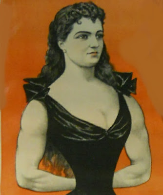 Another article noted that "When she appears on the stage any member or members of the audience is at liberty to put her strength to test in any way that he may choose." Turns out this wasn't always the best idea for "She took one luckless youth by the nape of the neck and slammed him into an empty barrel, which she then used as a baseball, scaring the life out of the fellow as she tossed him into the air, all this because the man said he thought she was but a trickster."